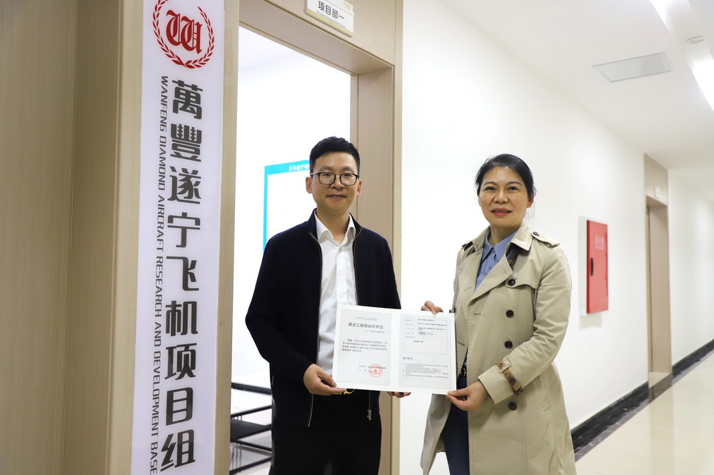 遂宁万丰飞机复合材料零部件制造基地建设项目基建负责人丁旭辉(左)从遂宁市自然资源和规划局相关负责人(右)手中接过《建设工程规划许可证》。