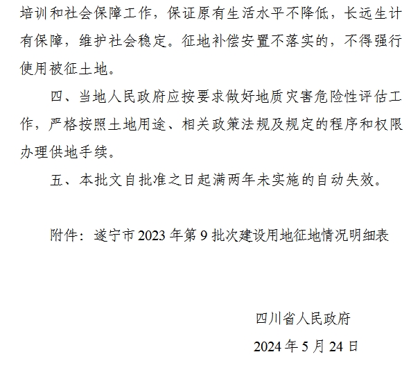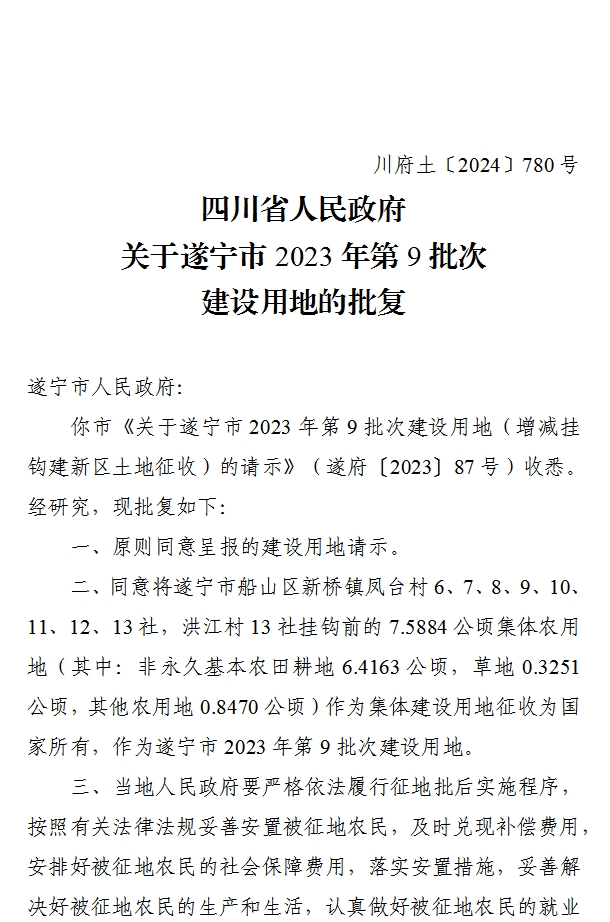 四川省人民政府关于遂宁市2023年第9批次建设用地的批复(川府土〔2024〕780号)