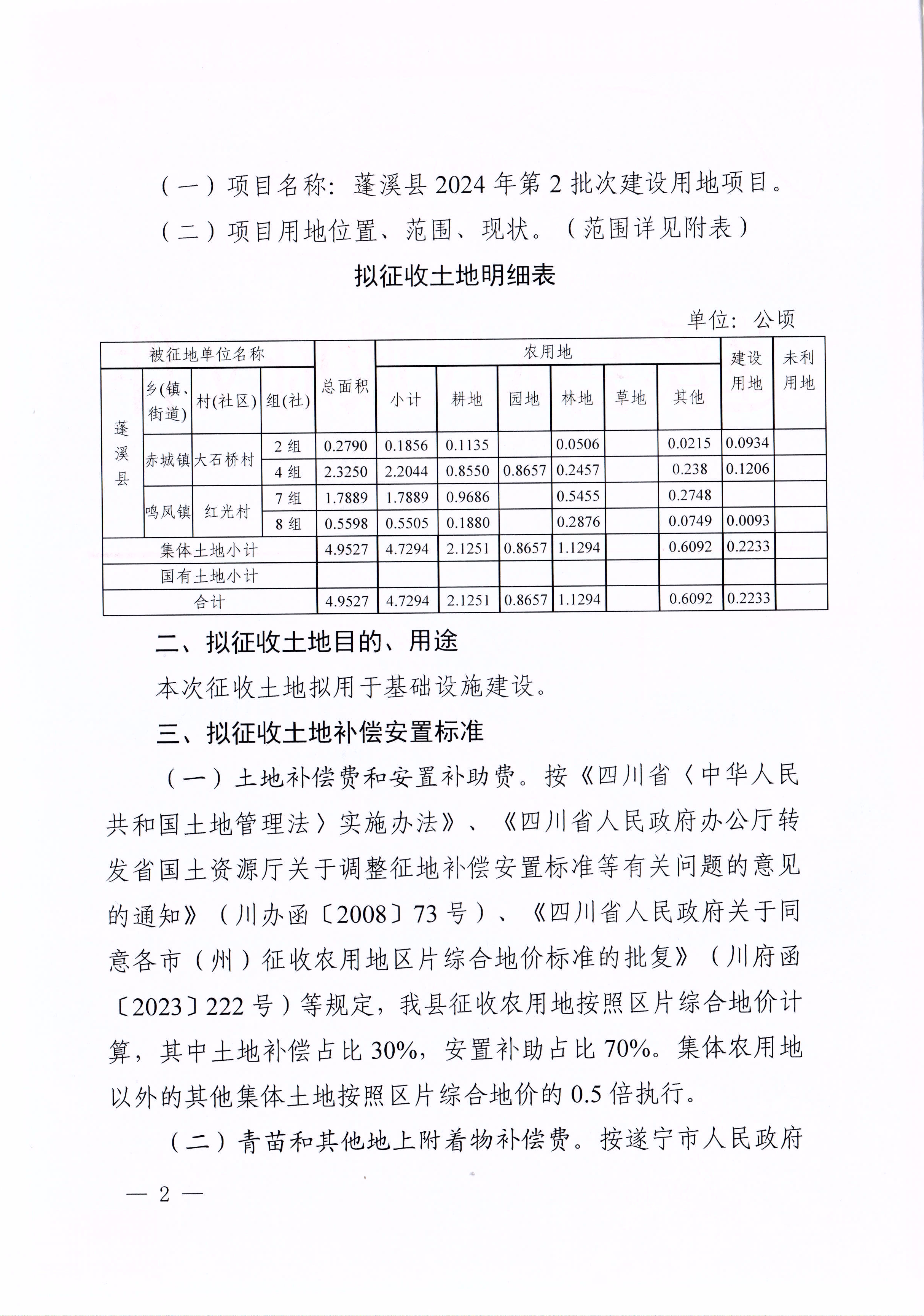 蓬溪县人民政府关于蓬溪县2024年第2批次建设用地项目征地补偿安置方案的公告(蓬府公〔2024〕13号)