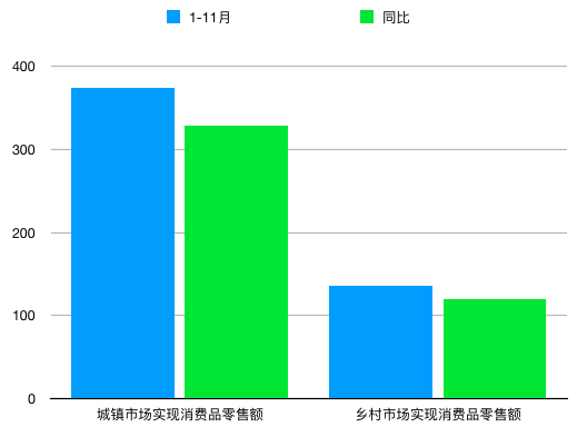 1-11月,遂宁城乡消费市场协调发展,乡村快于城镇。城镇市场实现消费品零售额374.46亿元,同比增长12.1%;乡村市场实现消费品零售额136.24亿元,同比增长12.4%,快于城镇市场0.3个百分点。