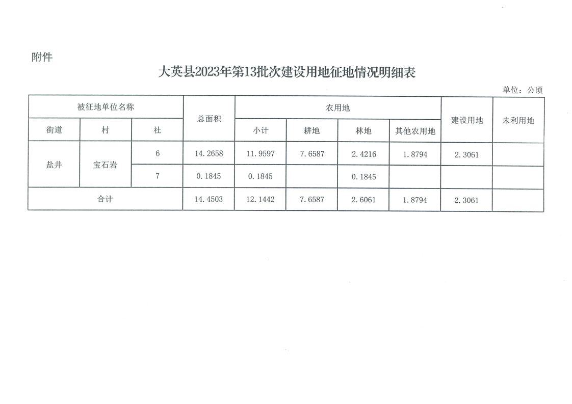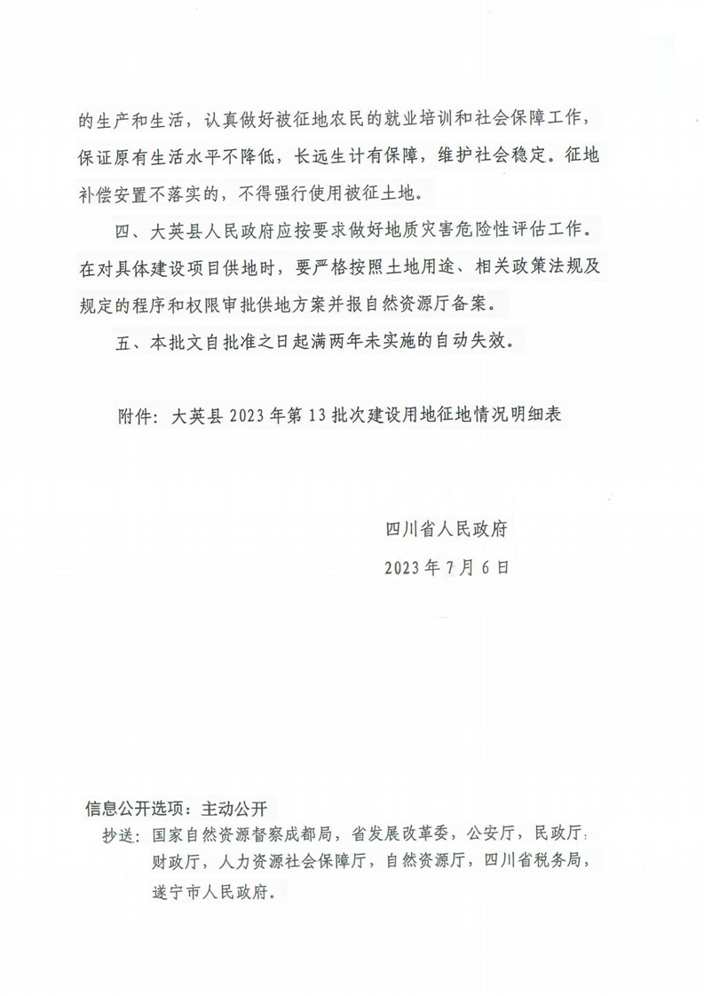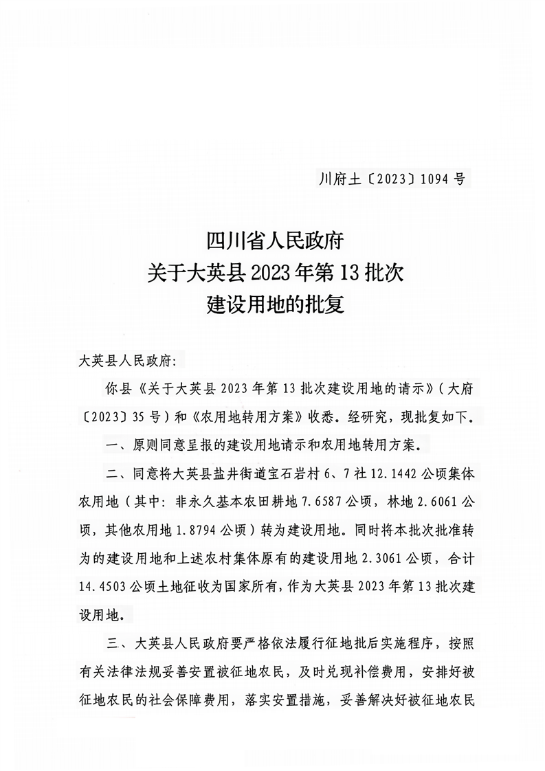 四川省人民政府关于大英县2023年第13批次建设用地的批复(川府土〔2023〕1094号 )