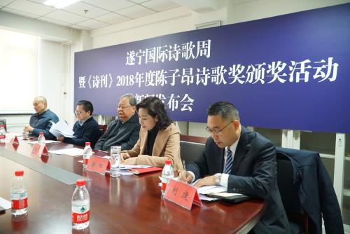 为贯彻落实习近平新时代中国特色社会主义思想和党的十九大精神,弘扬中华优秀诗歌,发掘优秀文艺人才,促进诗歌事业的繁荣,由中国作家协会《诗刊》社、中共遂宁市委宣传部、遂宁市文化广电新闻出版局联合举办的“遂宁国际诗歌周暨《诗刊》2018年度陈子昂诗歌奖颁奖活动”新闻发布会于1月26日在《诗刊》社召开。