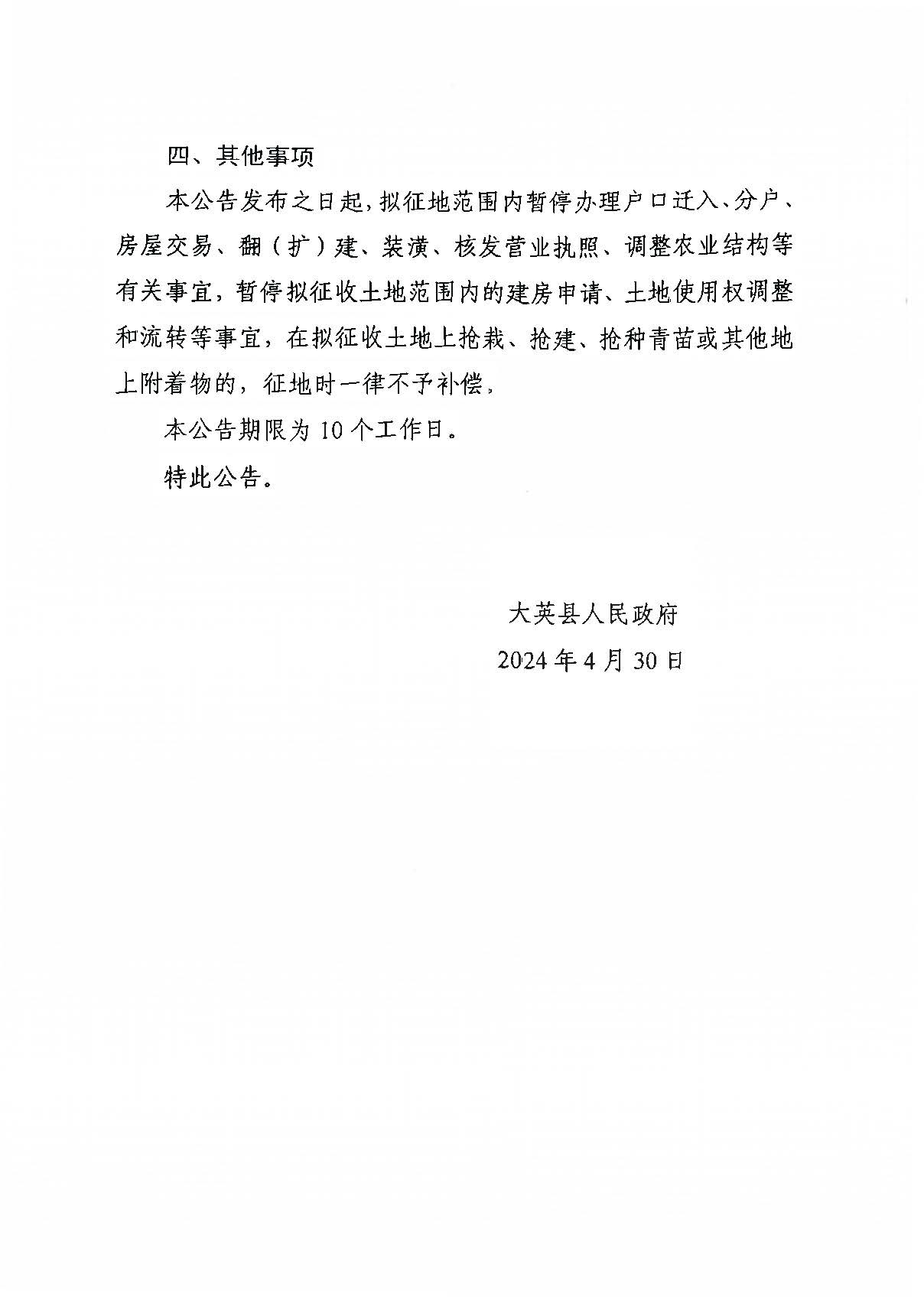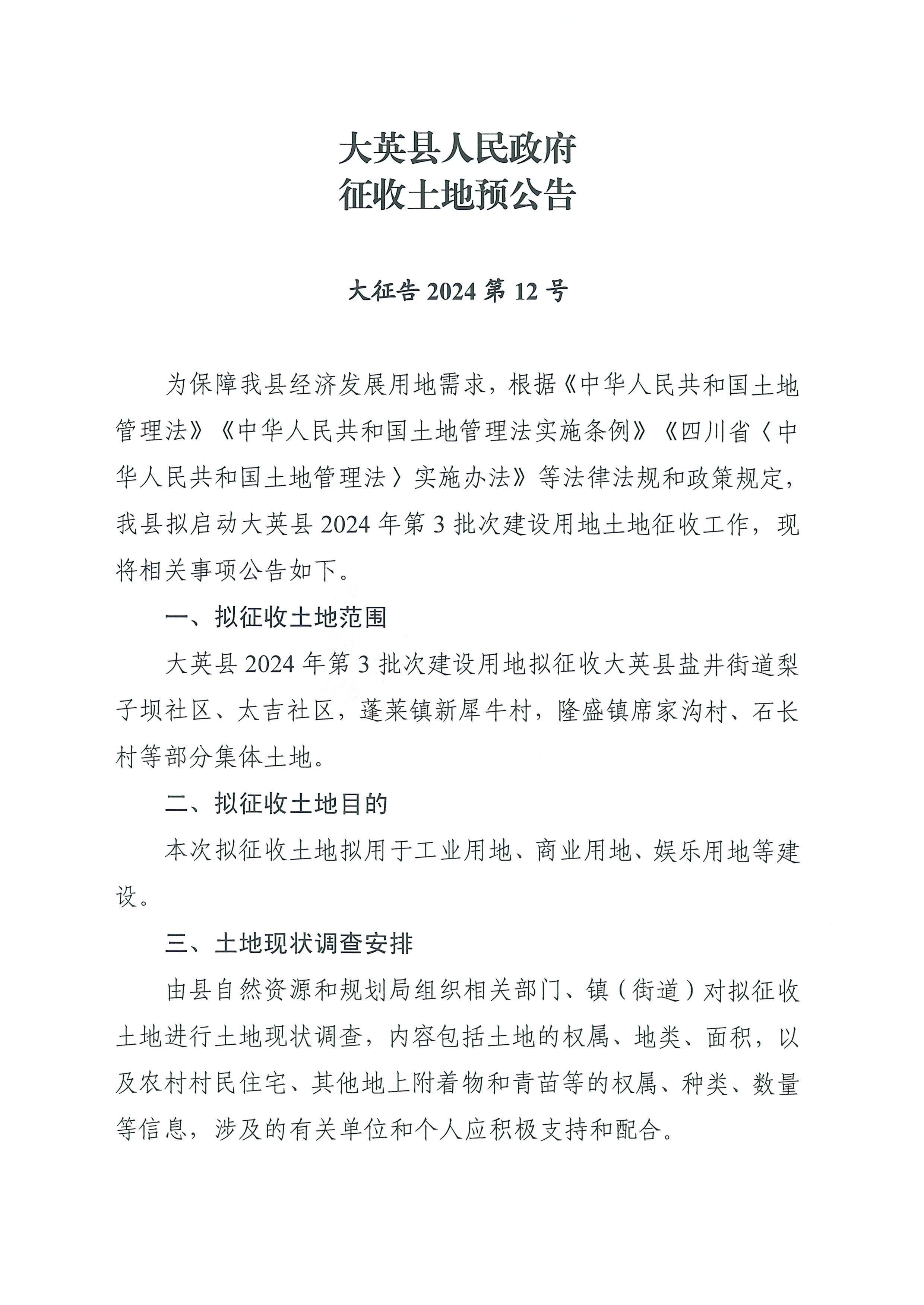 大英县人民政府征收土地预公告(大征告2024第12号)
