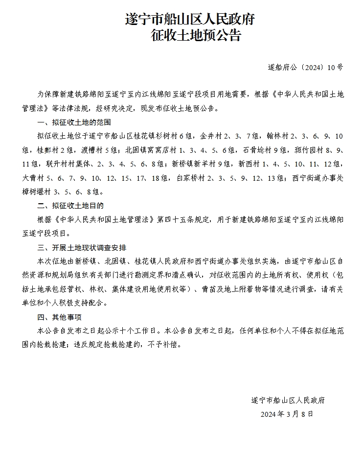 遂宁市船山区人民政府征收土地预公告 (遂船府公〔2024〕10号)