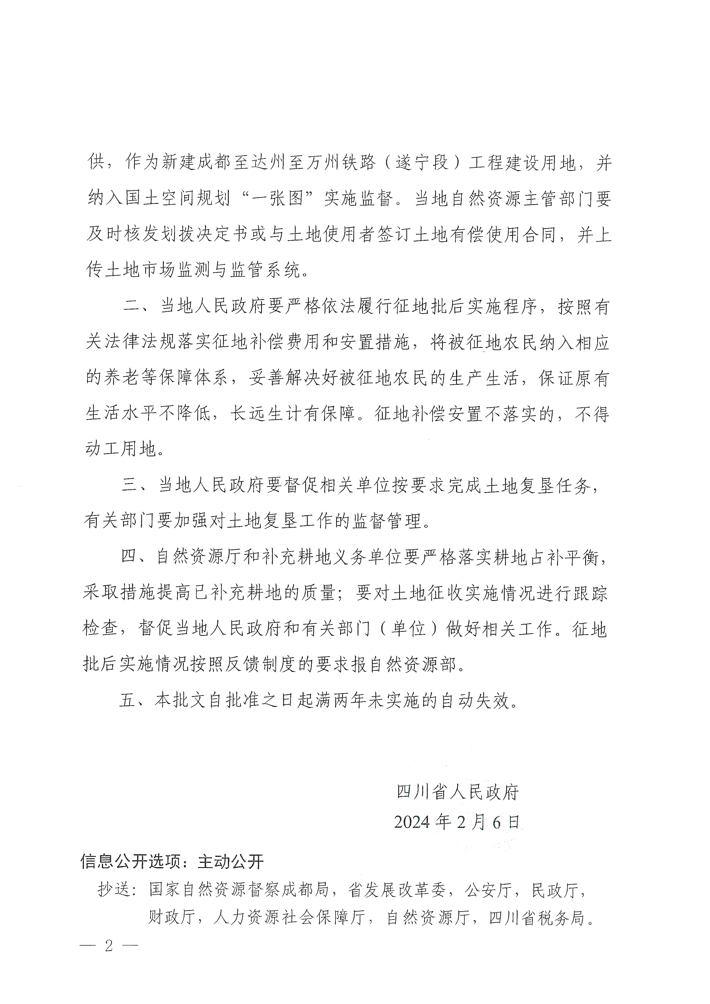 四川省人民政府关于新建成都至达州至万州铁路(遂宁段)工程建设用地的批复(川府土〔2024〕78号)