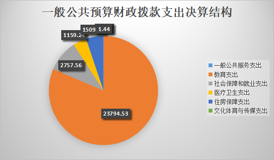 遂宁市教育局2017年一般公共预算财政拨款支出29244.73万元,主要用于以下方面:一般公共服务支出22.01万元,占0.08%;教育支出23794.53万元,占81.36%;社会保障和就业支出2757.56万元,占9.43%;医疗卫生支出1159.23万元,占3.96%;住房保障支出1509.94万元,占5.165%;文化体育与传媒支出1.44万元,占0.005%。