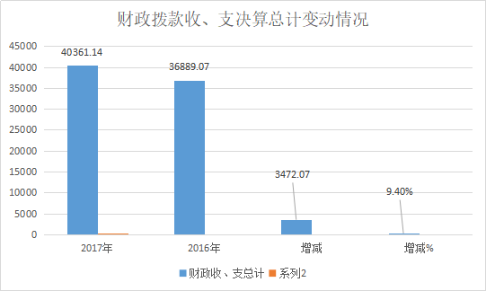 遂宁市教育局2017年财政拨款收、支总计40,361.14万元。与2016年相比,财政拨款收、支总计增加3472.07万元, 增长9.4%,主要是财政拨款增加1300余万元,其他收入增加2300万元。(柱状图)