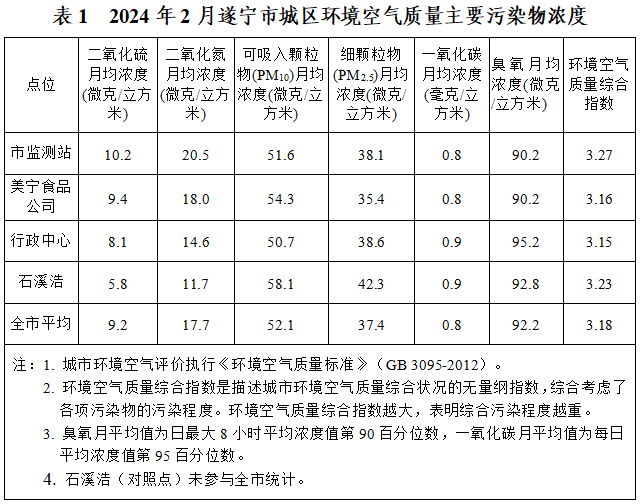 表1  2024年2月遂宁市城区环境空气质量主要污染物浓度