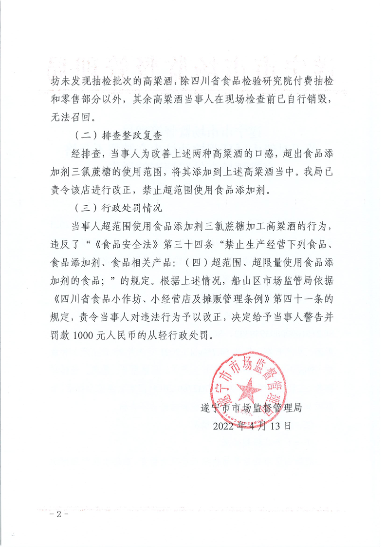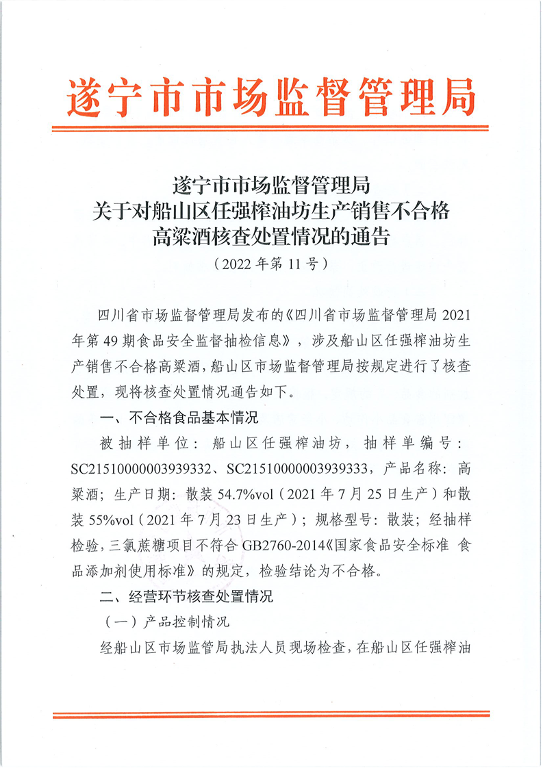 遂宁市市场监督管理局关于对船山区任强榨油坊生产销售不合格高梁酒核查处置通告(2022年第11号)
