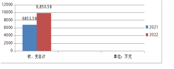 2022年度收、支总计9850.58万元。与2021年相比,收、支总计各增加2997万元,增长30.42%。主要变动原因是我校西校区三期工程建设正式实施。