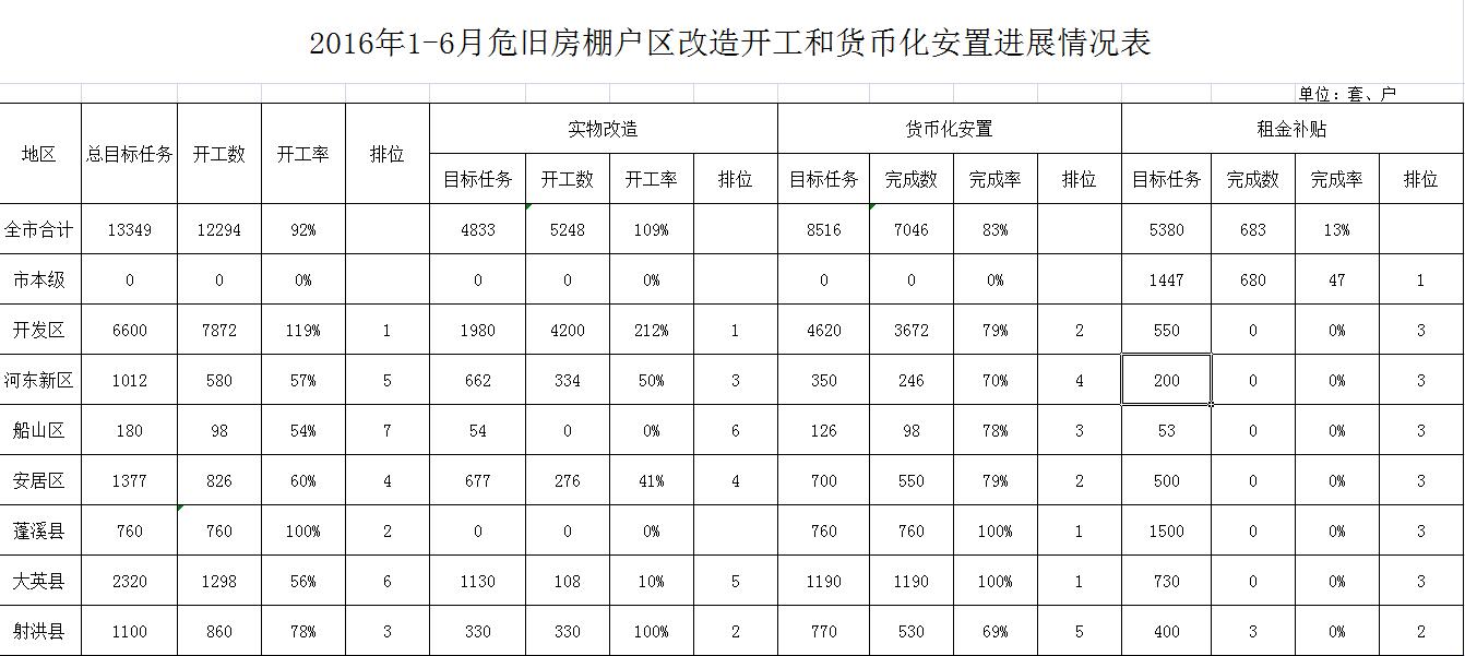 2016年1-6月危旧房棚户区改造开工和货币化安置进展情况表