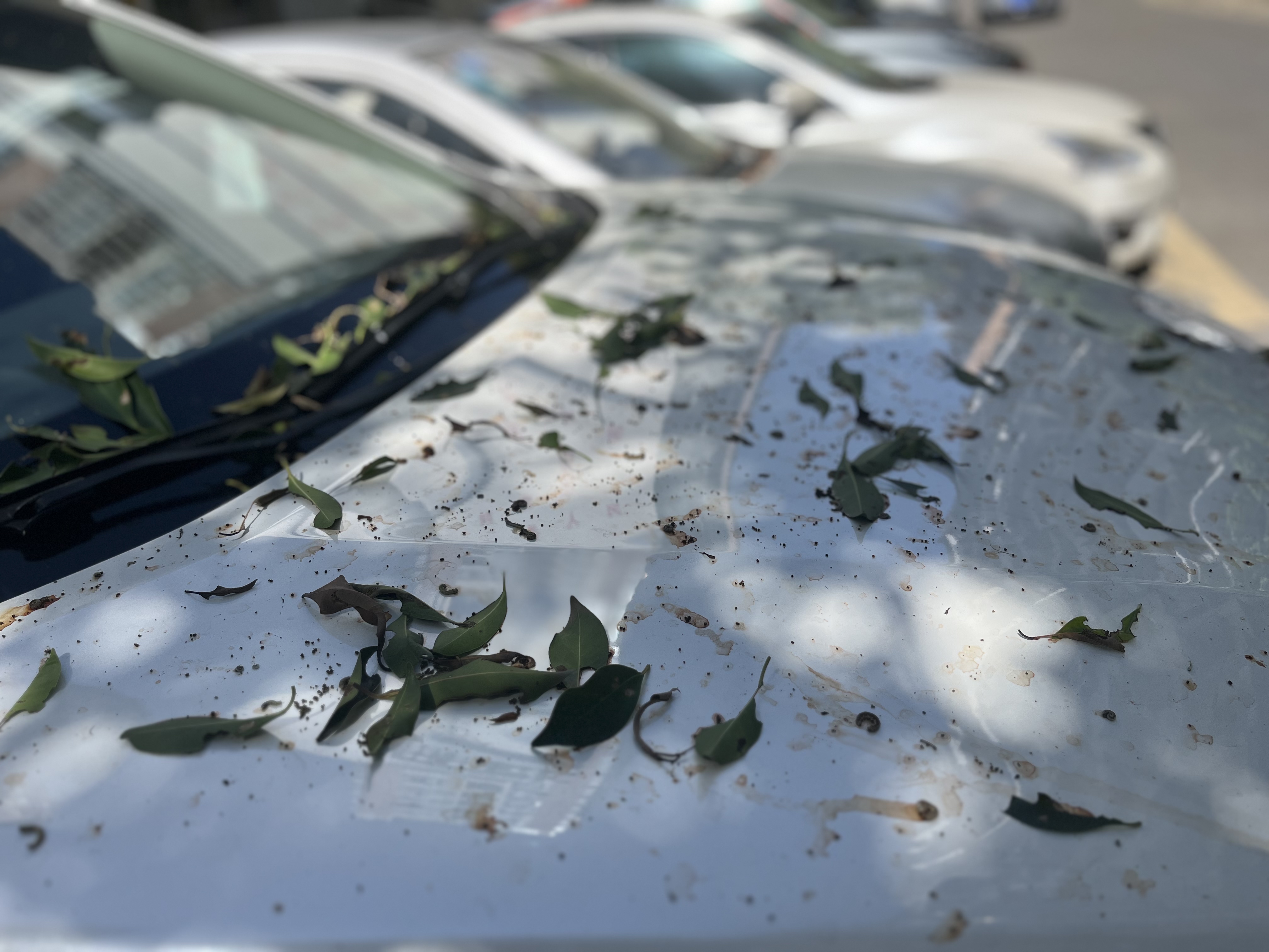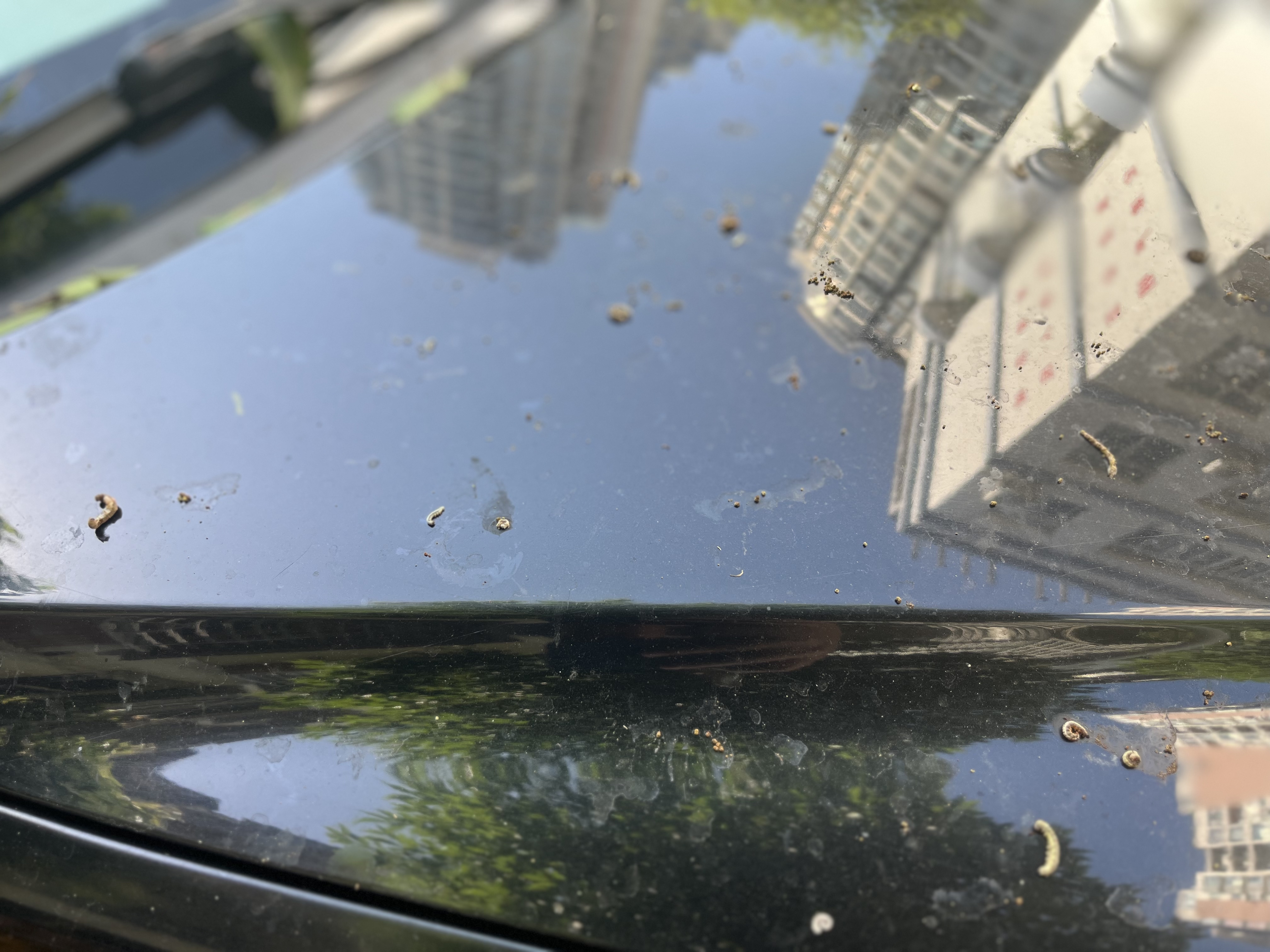 记者看到,不光是人行道上落满了虫子的粪便和被其咬碎的树叶,就连停在机动车道旁边的汽车上也落满了这些,甚至有些汽车的车顶和挡风玻璃都被糊得看不清本来面目。
