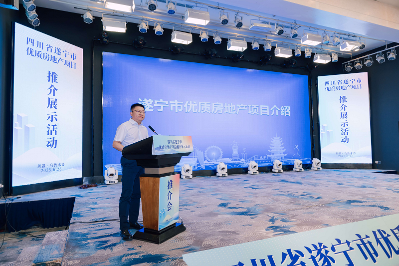 为了广泛宣传展示遂宁市城市形象和优质房地产项目,更好满足购房者多元化和改善性住房需求,2025年6月26日下午,由遂宁市住房和城乡建设局主办的“遂宁市优质房地产项目推介展示活动”在新疆乌鲁木齐市吐哈石油大厦天山厅顺利召开。遂宁市政府副市长张韬、副秘书长胡建军,市住房城乡建设局党组书记、局长邓勇等出席活动。参加本次活动的嘉宾有乌鲁木齐市遂宁商会、重庆商会、四川总商会联合会、新疆生产建设兵团川渝商会等各大商会的会长以及川渝企业家代表、遂宁市在乌鲁木齐市经商务工人员、乌鲁木齐市市民等210余人。