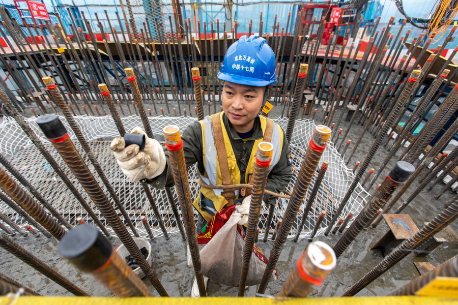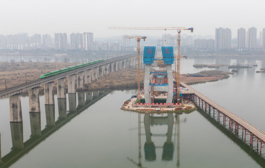 2月28日,在成达万高铁遂宁涪江特大桥项目施工现场,工人正在进行斜拉桥塔柱及边跨现浇梁施工。作为西南地区同类型桥梁中跨度最大的双塔斜拉桥,该桥主跨全长305米,目前90号主塔已完成60.5米,91号主塔已完成54.5米,主桥整体施工进度过半,预计今年7月前完成主塔封顶。