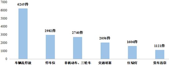 (七)交通安全20083件。一是机动车辆乱停乱放,道路交通堵塞,车辆违规行驶,货车超速超载、闯红灯现象突出;二是对交警作出的处罚决定有异议,赔偿纠纷调解、交通事故责任认定书出具不及时;三是建议增设或及时维护交通信号灯、监控设备、停车位等,保障通行安全;四是咨询人力客运三轮车专项整治政策及驾驶证年审程序。