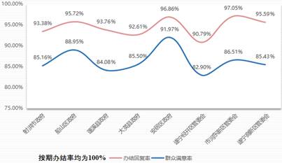 2020年,12345热线受理县(市、区)、市直园区有效来电39.70万件,同比增长19.30%,占有效来电总量的68.33%。转交县(市、区)、市直园区办理26.72万件,按期办结率100%;办结回复率94.10%,同比增长0.33%;群众满意率86.20%,同比增长4.74%。