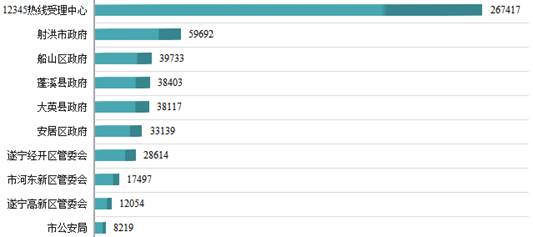(三)一级网络单位办理情况。县(市、区)、市直园区中,办件量最多的是射洪市政府59692件,最少的是遂宁高新区管委会12054件。市直部门中,办件量最多的是市公安局8219件,年办件量达100件以上的24个,100件以下的29个。