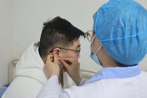 患者正在进行耳穴埋豆治疗。