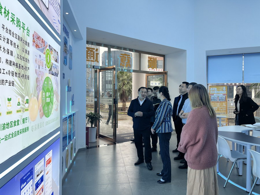 考察组一行先后前往中国供销智慧冷链产业园、西部铁路物流园、智慧物流大数据中心等地参观,随后开展陆港型物流枢纽建设座谈会。遂宁高新区党工委委员、管委会副主任冉茂连主持座谈会,遂宁市商务局副局长余强,市粮食局直属局副局长敬海峡参加座谈会。