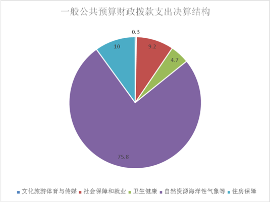 2021年一般公共预算财政拨款支出156.5万元,主要用于以下方面:文化旅游体育与传媒(类)支出0.5万元,占0.3%;社会保障和就业(类)支出14.5万元,占9.2%;卫生健康支出7.4万元,占4.7%;自然资源海洋性气象等支出118.4万元,占75.8%;住房保障支出15.7万元,占10%。