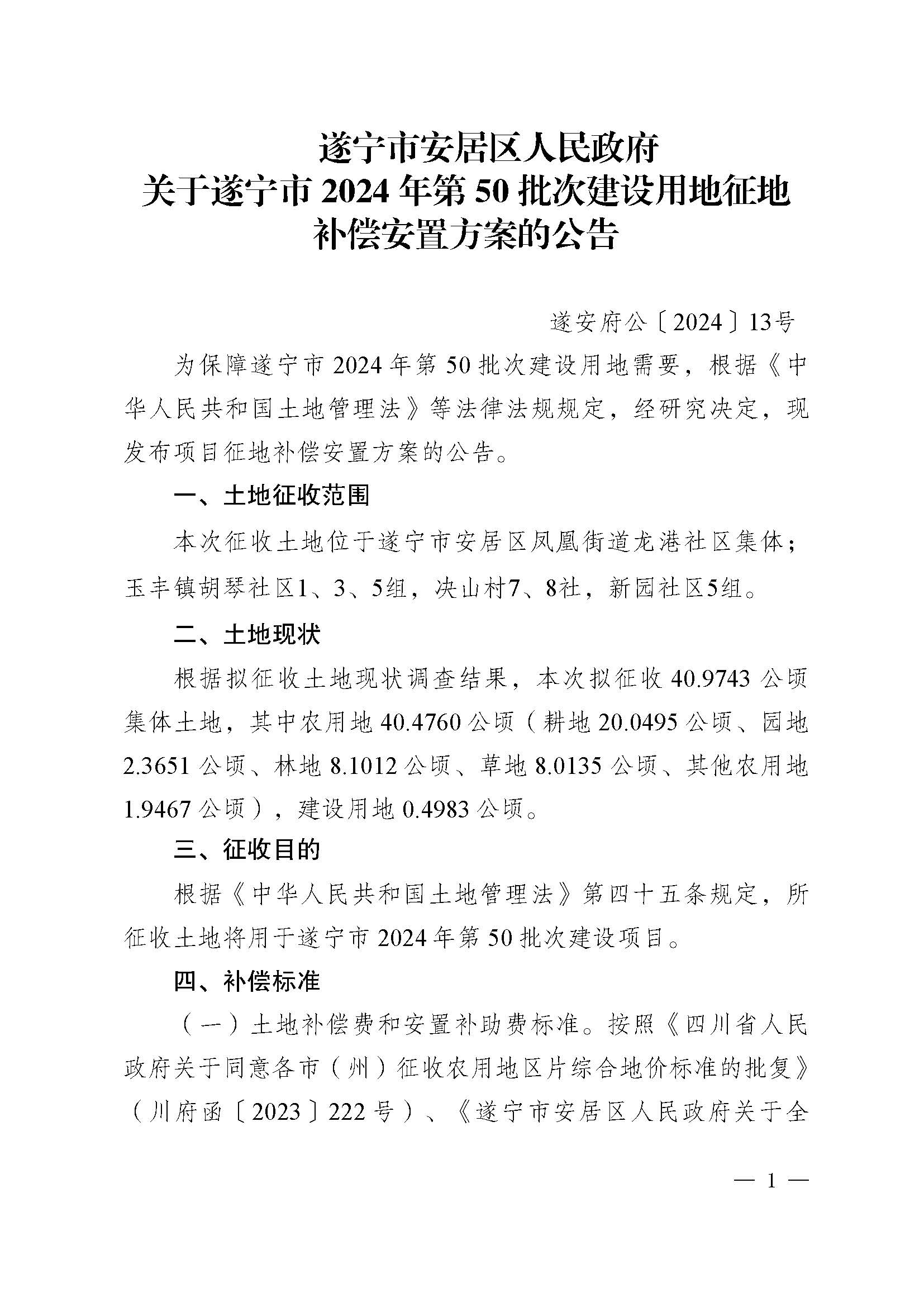 遂宁市安居区人民政府关于遂宁市2024年第50批次建设用地征地补偿安置方案的公告(遂安府公〔2024〕13号)