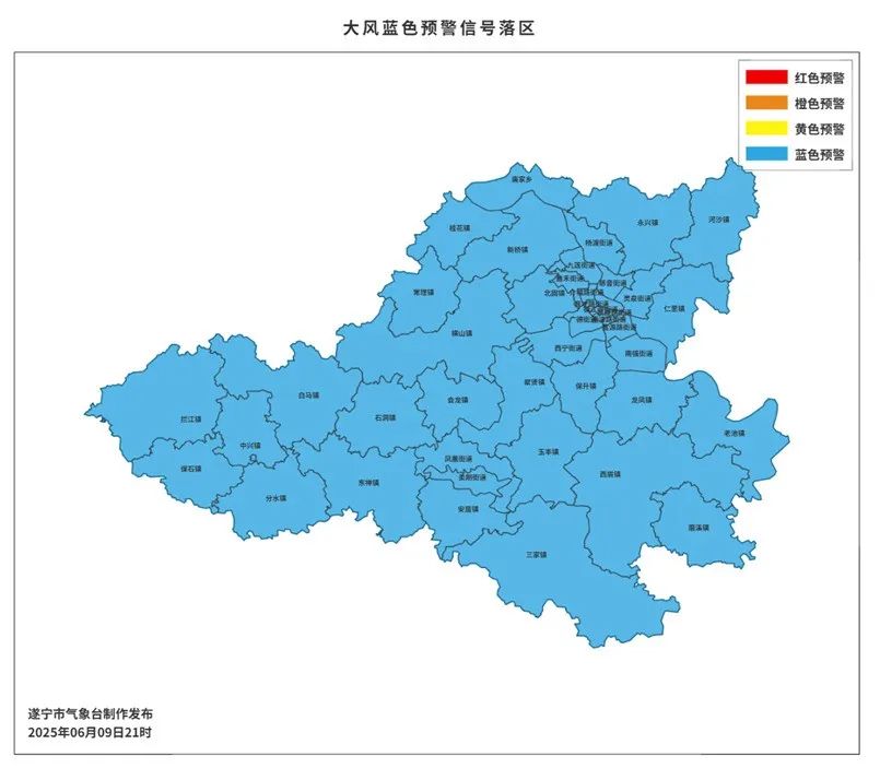 目前船山区桃花山已出现14.4m/s的阵性大风,预计船山区杨渡街道、慈音街道、九莲街道、嘉禾街道、广德寺街道、育才路街道、镇江寺街道、凯旋路街道、介福路街道、南津路街道、富源路街道、西宁街道、唐家乡、保升镇、老池镇、北固镇、永兴镇、桂花镇、新桥镇、河沙镇、龙凤镇、仁里镇、灵泉街道、南强街道,安居区柔刚街道、凤凰街道、常理镇、聚贤镇、磨溪镇、西眉镇、玉丰镇、三家镇、保石镇、拦江镇、石洞镇、分水镇、东禅镇、会龙镇、横山镇、中兴镇、白马镇、安居镇等乡镇(街道)12小时内将受大风影响,平均风力可达6级以上或者阵风7级以上,可能伴有雷电和分散阵雨。请注意加固围板、棚架、广告牌等搭建物,保证行路、行车安全,刮风时不要在广告牌、临时搭建物等下面逗留,防范简易屋顶、棚、临时检测帐篷、广告牌、行道树干等因大风造成的次生灾害。
