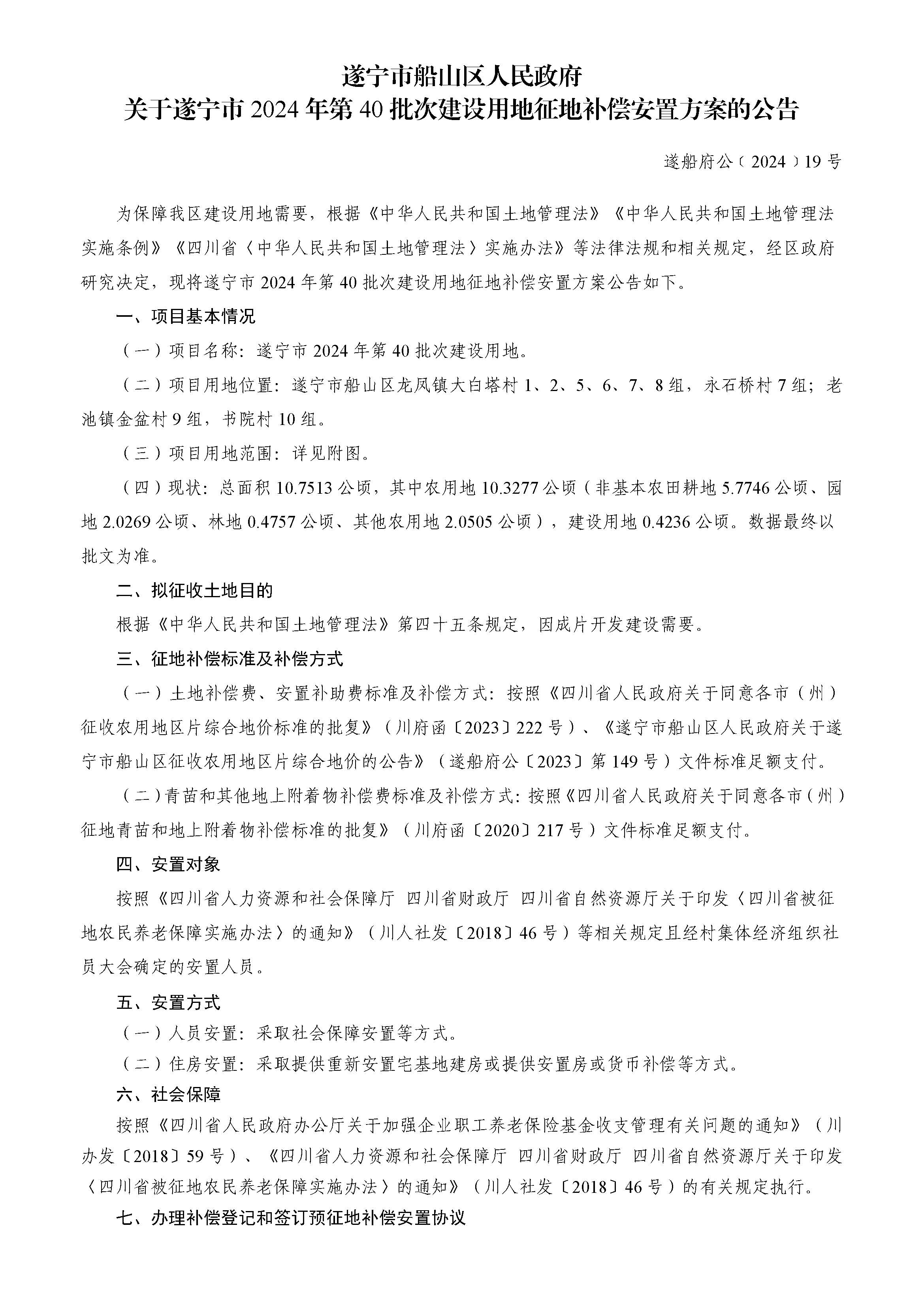 遂宁市船山区人民政府关于遂宁市2024年第40批次建设用地征地补偿安置方案的公告 (遂船府公〔2024〕19号)