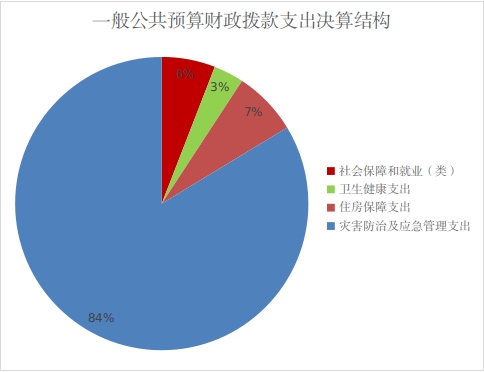 2020年一般公共预算财政拨款支出131.96万元,主要用于以下方面:一般公共服务(类)支出0万元,占0.00%;教育支出(类)0万元,占0.00%;科学技术(类)支出0万元,占0.00%;文化旅游体育与传媒(类)支出0万元,占0.00%;社会保障和就业(类)支出7.77万元,占5.89%;卫生健康支出4.40万元,占3.33%;住房保障支出9.38万元,占7.11%;灾害防治及应急管理支出110.41万元,占83.67%。