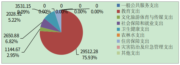 2022年一般公共预算财政拨款支出38867.9万元,主要用于以下方面:一般公共服务支出0万元,占0%;教育支出29512.28万元,占75.93%;科学技术支出0万元,占0%;文化旅游体育与传媒支出1144.67万元,占2.95%;社会保障和就业支出2650.88万元,占6.82%;卫生健康支出3531.15万元,占9.09%;住房保障支出2028.92万元,占5.21%。