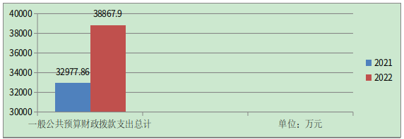 2022年一般公共预算财政拨款支出38867.9万元,占本年支出合计的99.65%。与2021年相比,一般公共预算财政拨款支出增加5890.04万元,增长17.86%。主要变动原因是为落实“两个只增不减”保障各类教育投入。