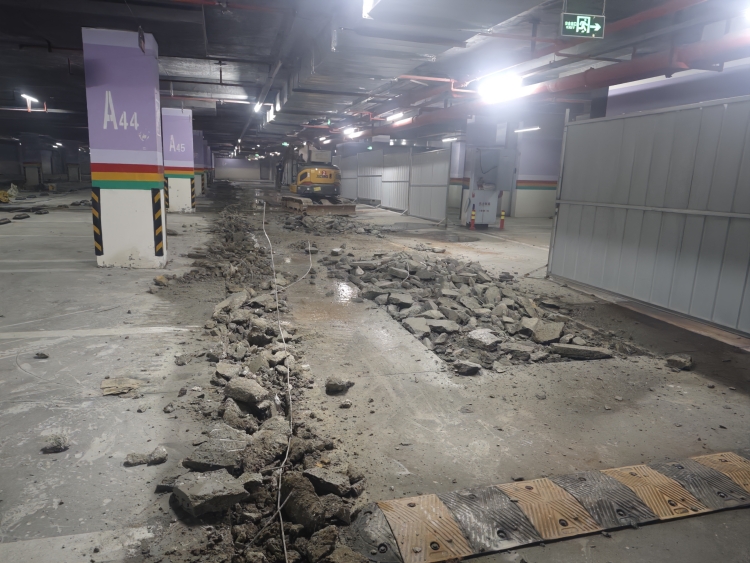 9月20日上午,记者随同遂宁经开区管委会党政办、遂宁经开区建设与交运局工作人员再次来到金科集美天宸小区。在小区的地下车库,远远便可听见机械作业的轰鸣声。记者看到,原本积水最为严重的区域已经进行了打围封闭,施工人员正操作大型机械对地面水泥层进行开挖作业,以便准确寻找渗漏点。