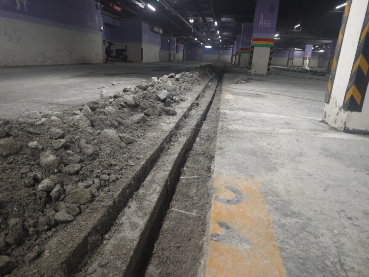 “目前我们正在进行地下车库积水井和排水沟的开挖作业。”四川遂美建设工程有限公司现场负责人周祥彬告诉记者,通过这种方式将目前车库地面和下方的积水全部排出,才能准确找到下方的渗漏水范围和点位,“找到准确点位后,就会对渗漏水点位进行围模灌浆,灌堵漏材料。”