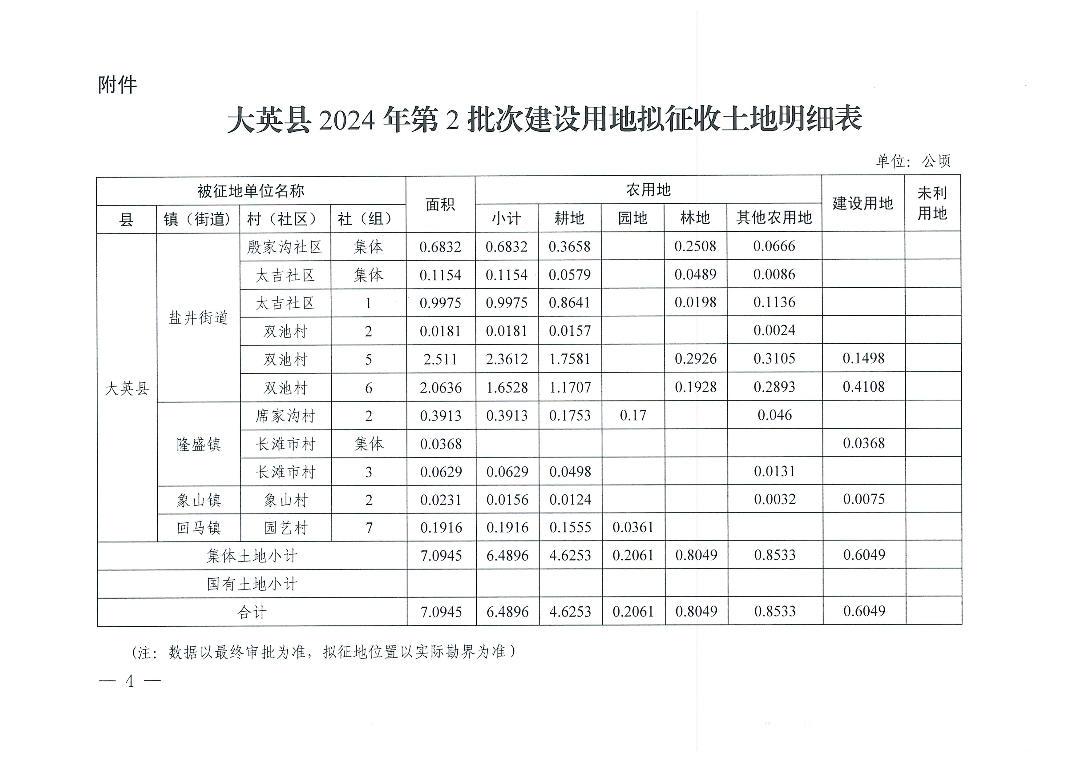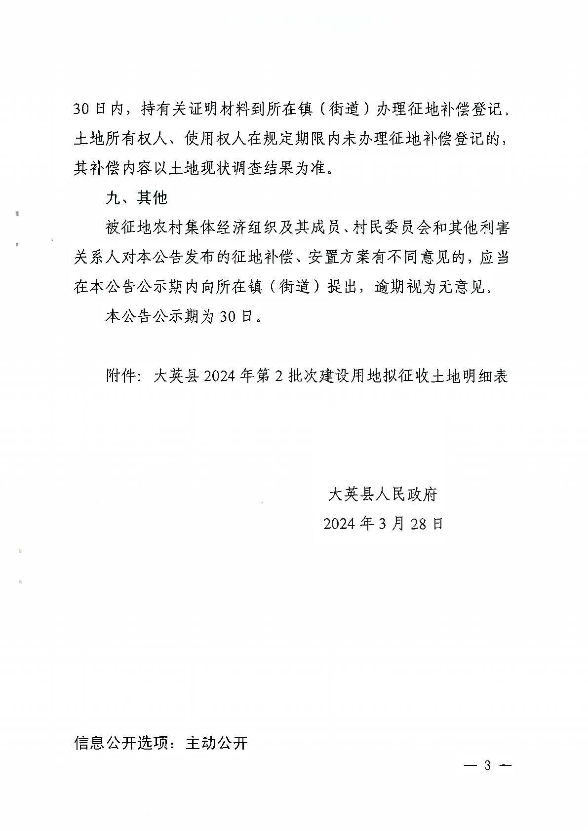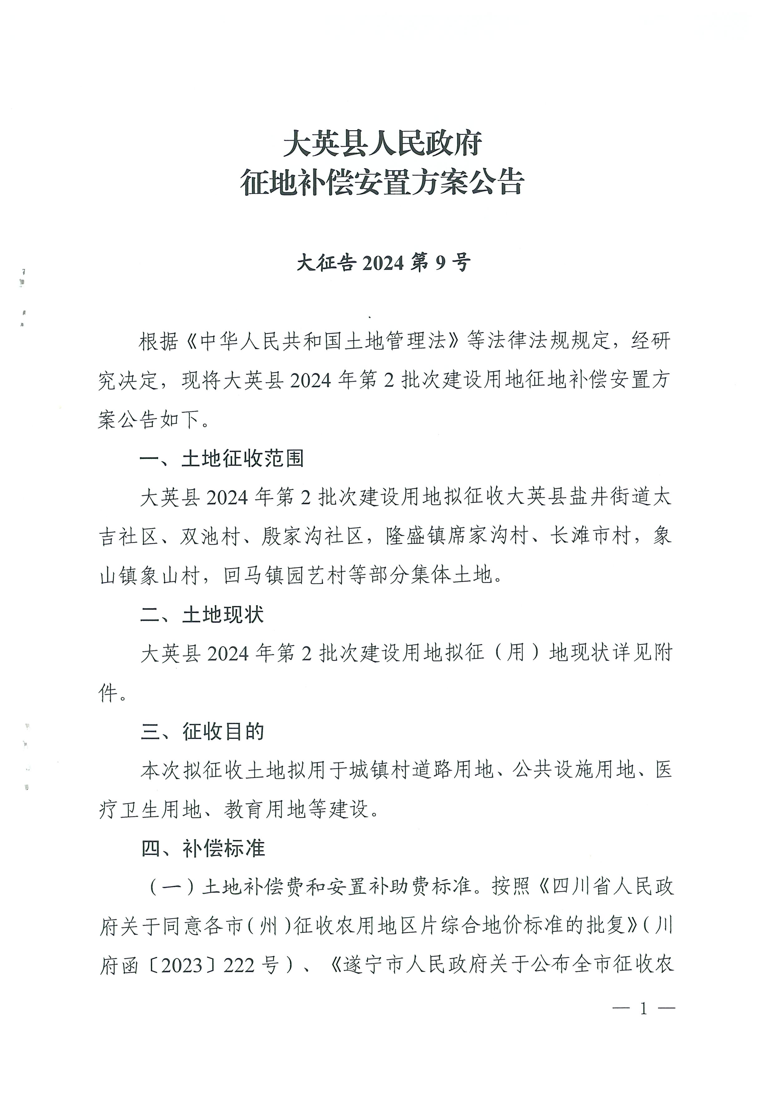 大英县人民政府征地补偿安置方案公告(大征告2024第9号)