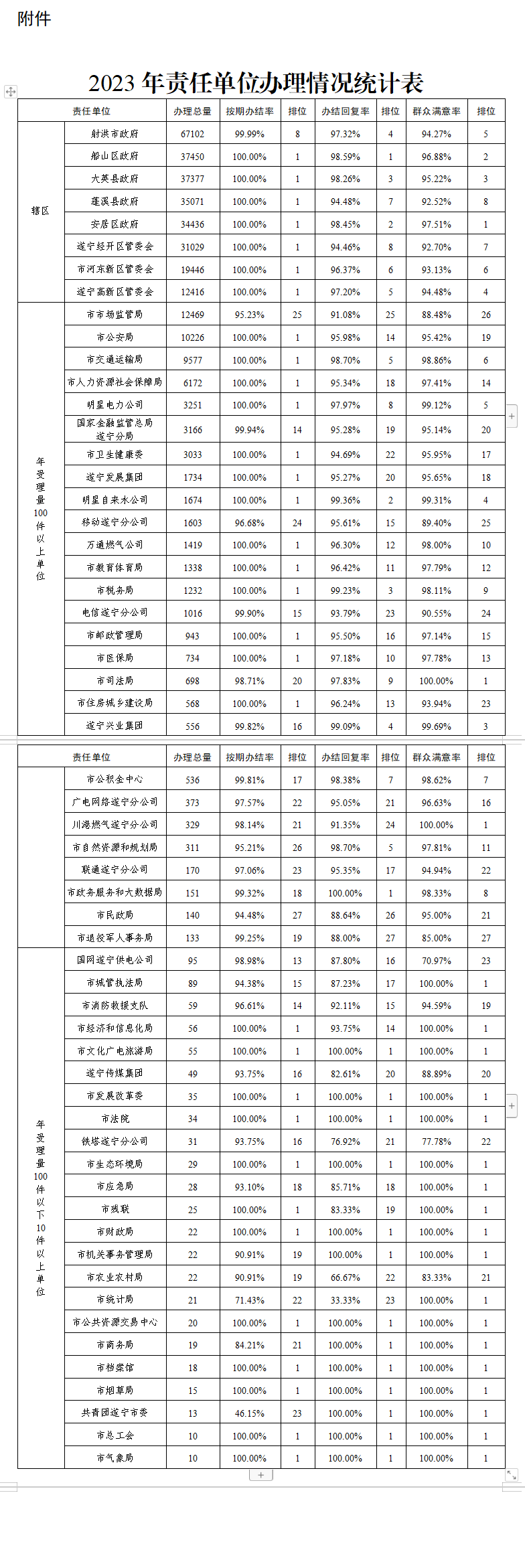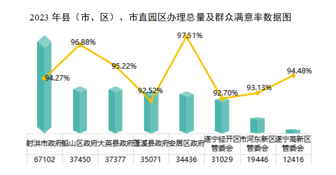 从办理质效看,除射洪市逾期办理4件外,其余各县(市、区)、市直园区按期办结率均为100%。船山区办结回复率最高,达98.59%、安居区其次,办结回复率为98.45%,遂宁经开区最低,办结回复率为94.46%。群众满意率同比均有所下降,蓬溪县下降最多,同比下降4.26%,遂宁高新区下降最少,同比下降0.79%。船山区、安居区、大英县群众满意率达95%以上,效果较好。