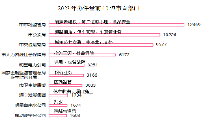 从办理数量看,市市场监管局最高,达12469件,占市直部门办理量的19.33%,主要涉及消费者维权、商户证照办理等,其次是市公安局10226件,占市直部门办理量的15.85%,主要涉及道路拥堵、停车管理等。