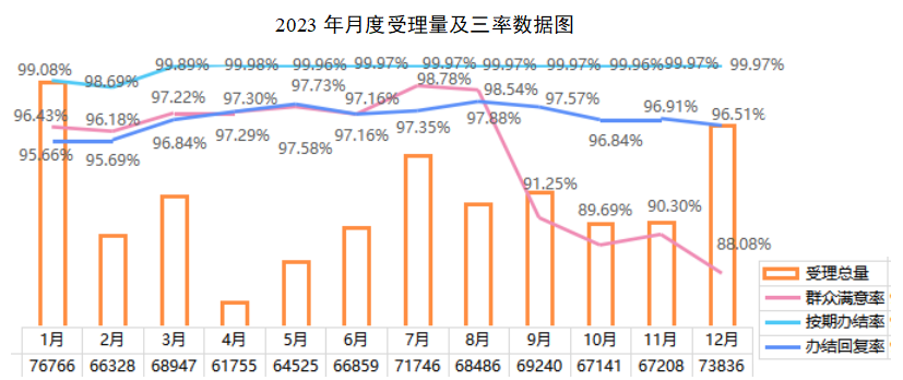 从受理量看,来电量呈高开低走趋势,1月来电量最高,达7.6万件,4月来电量最低,为6.1万件。从办理效果看,按期办结率基本保持在99.9%以上,办结回复率保持在95%以上,8月办结回复率最高,达97.88%,1月办结回复率最低,为95.66%;群众满意率7月最高,达98.78%,自9月起有所下滑,12月最低,群众满意率为88.08%。各承办单位要加强源头治理,着力推动解决突出问题,下一步深入查摆、深究问题、认真剖析,不断提升问题解决率、群众满意率。