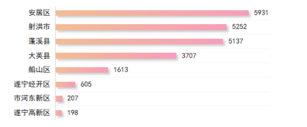 从办理数量看,射洪市最高,达6.71万件,占县(市、区)、市直园区办理量的24.46%,遂宁高新区最低,为1.24万件,占4.53%。县(市、区)、市直园区办理量同比均有所下降,市河东新区下降最多,同比下降22.40%,其次是船山区同比下降14.92%、蓬溪县同比下降10.34%,安居区下降最少,同比下降2.36%。