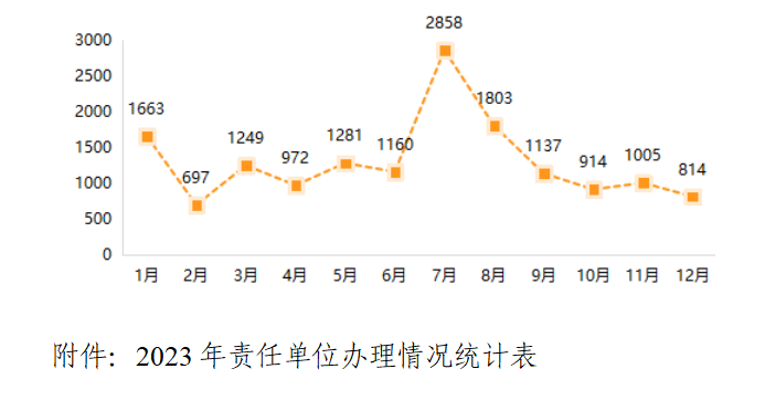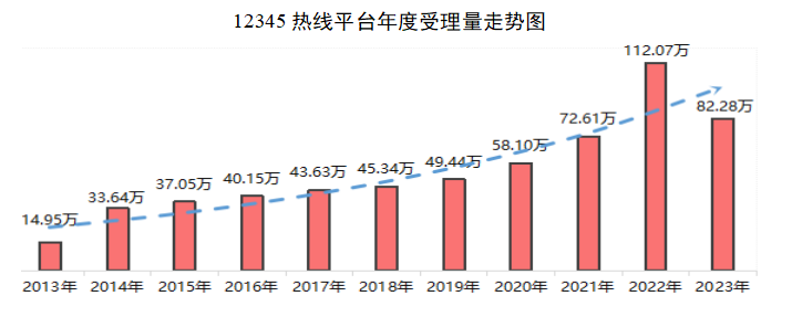 2023年,12345热线受理群众来电82.28万件,同比下降26.58%,日均2254件。12345热线直接解释答复48.40万件,直办率58.82%,同比下降9.18%;转交责任单位办理33.88万件,按期办结率99.78%,同比增长0.51%;办结回复率96.92%,同比增长0.83%;群众满意率95.05%,同比下降2.16%。