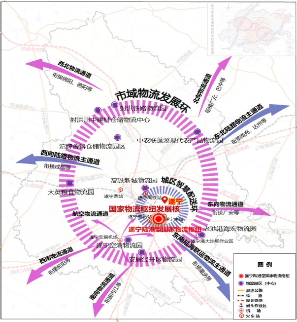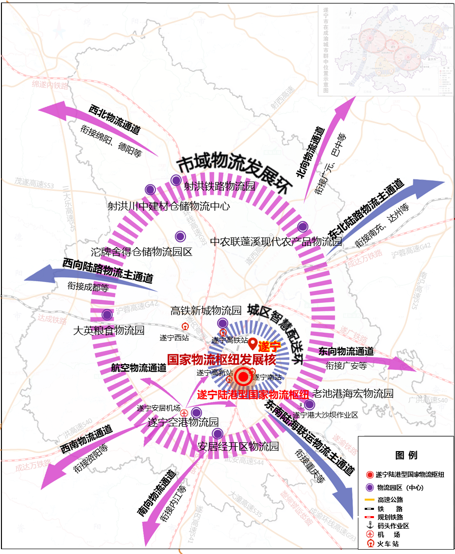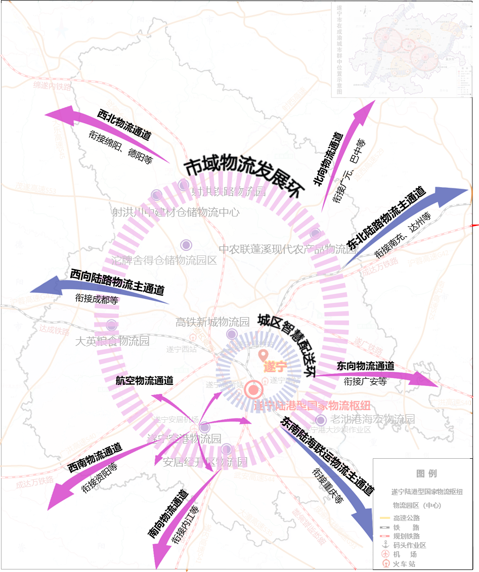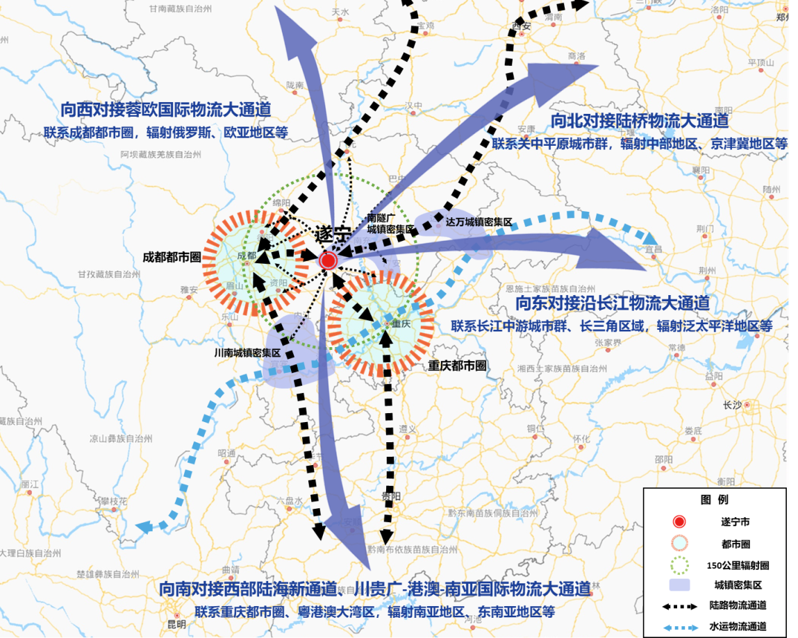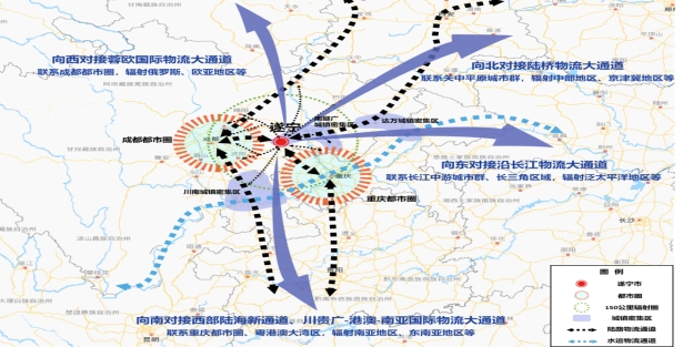 北向物流通道。依托遂西高速(S29),重点衔接广元市、巴中市。
