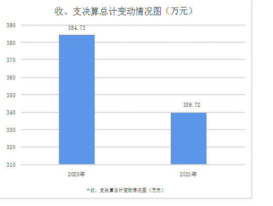 2021年度收、支总计339.72万元。与2020年相比,收、支总计各减少45万元,下降11.7%。主要变动原因是厉行节约,严格控制预算。