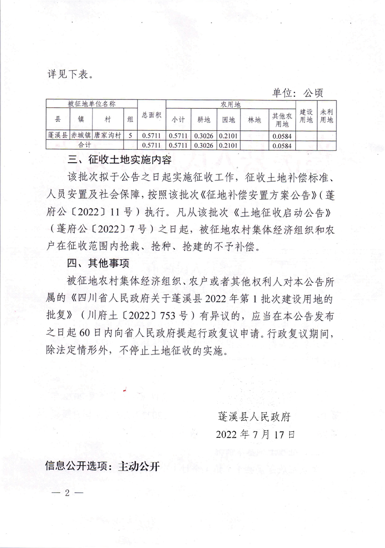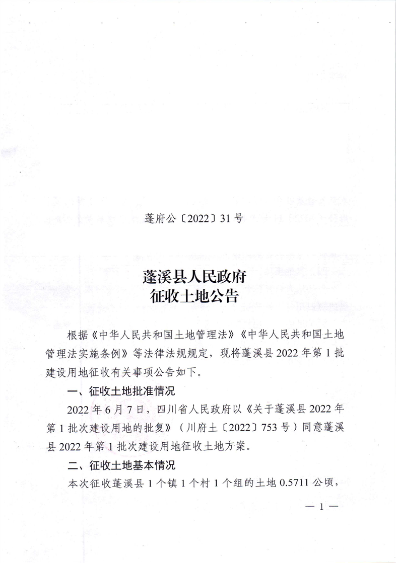 蓬溪县人民政府征收土地公告(蓬府公〔2022〕31号)2022年第1批建设用地