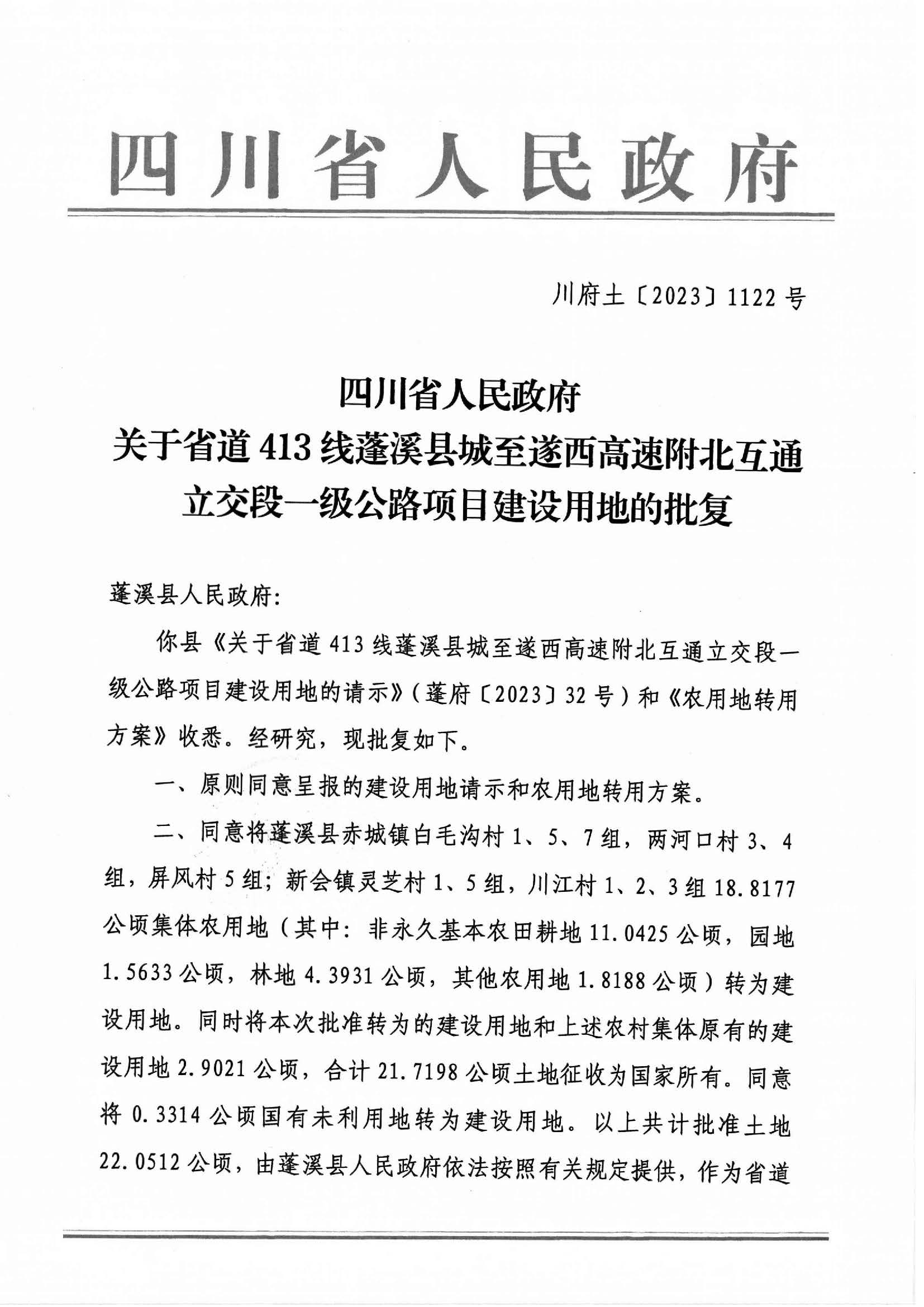 四川省人民政府关于省道413线蓬溪县城至遂西高速附北互通立交段一级公路项目建设用地的批复