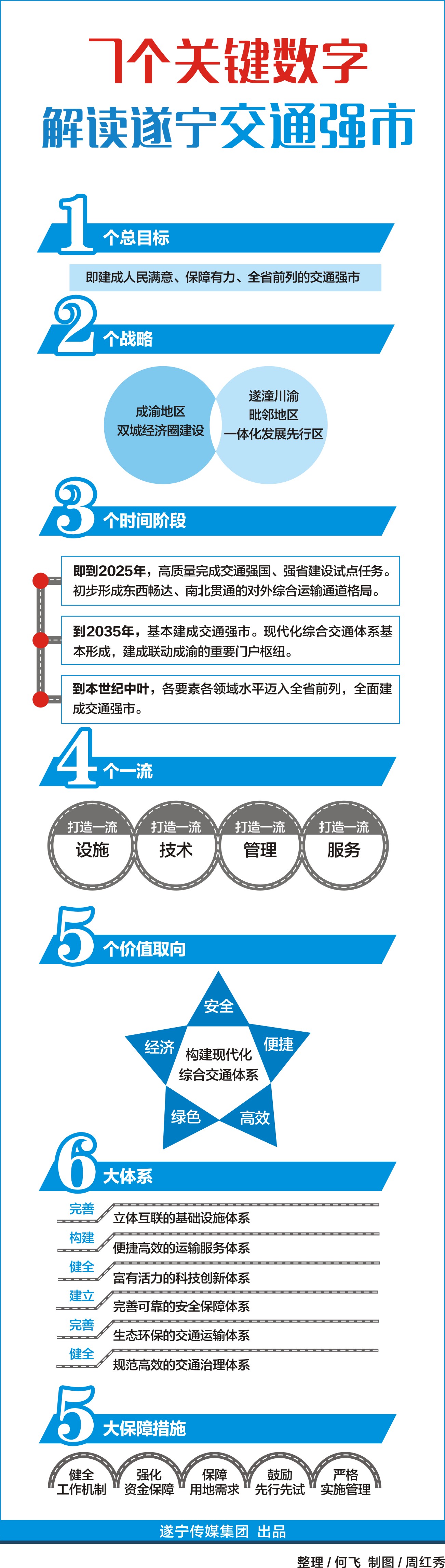 到2025年,高质量完成省上下达的交通强国建设试点任务。初步形成东西畅达、南北贯通的对外综合运输通道格局,出遂大通道达18条,交通对外开放水平进一步提升,城乡区域交通、遂潼交通一体化协调发展明显提升。
