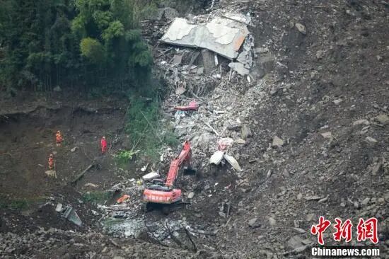 一受损民房边大型挖掘机正在滑坡体上开展清理和搜救工作。