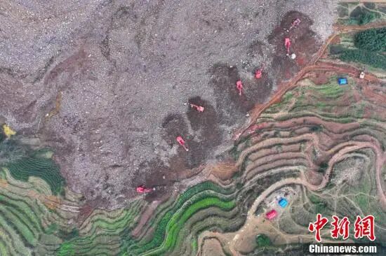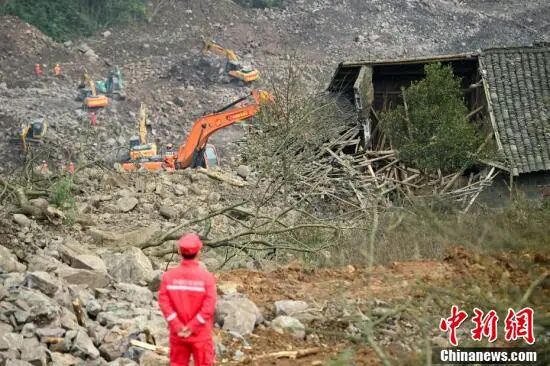 大型挖掘机在滑坡体上挖掘清理和搜救。