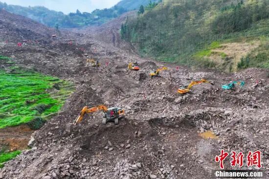 大型挖掘机正在滑坡体上开展清理和搜救工作。