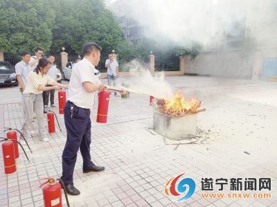 在火灾扑灭演练中,面对熊熊大火,参演员工在消防专家指导下,操作使用灭火器扑灭火势。县公安消防大队义务宣传员就“防火、灭火、逃生、自救”向全体参演员工做了深入浅出地讲解。