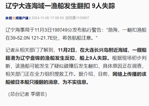记者从相关部门了解到,11月2日,在大连长兴岛附近海域,一艘船籍港为辽宁盘锦的渔船发生翻扣,船上9人失踪。根据现场初步判断,该渔船可能发生了疑似碰撞后发生翻扣,具体原因正在调查,相关部门正在全力组织搜救工作。据介绍,目前,网络上传播的该船被日本船只撞翻的消息,为不实信息。