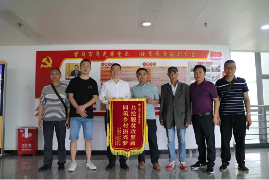 5月19日,射洪市天仙镇天马村村委会带领建档立卡贫困户代表胥洪泰在村第一书记和驻村工作队员的陪同下将一面绣有“共绘脱贫攻坚画 同筑乡村振兴梦”的锦旗送到遂宁市商务局,对市商务局历年来的帮扶工作表示深深的感谢。