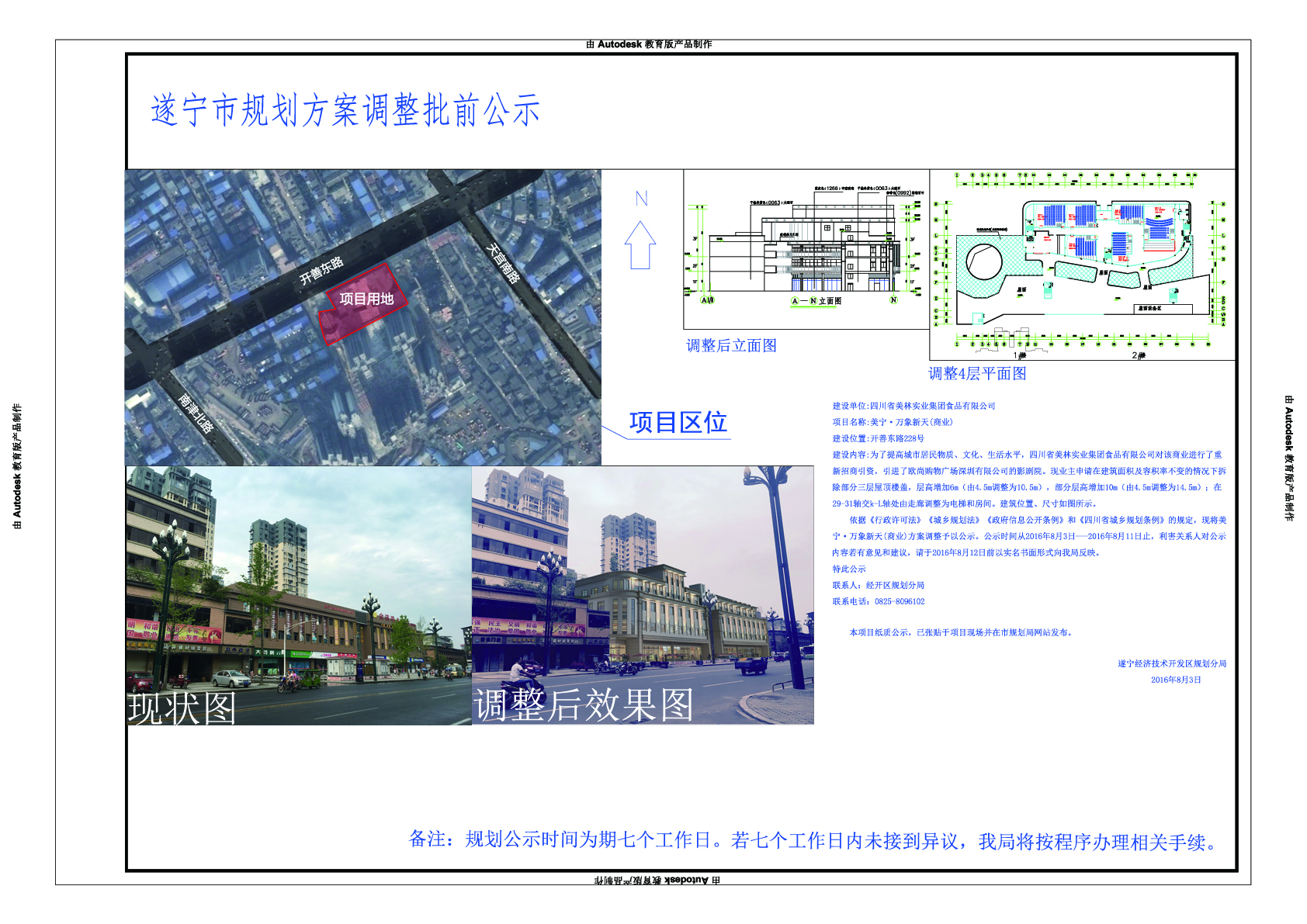 依据《中华人民共和国行政许可法》《城乡规划法》《中华人民共和国政府信息公开条例》和《四川省城乡规划条例》的规定,现将美宁·万象新天(商业)方案调整予以公示。公示时间从2016年8月3日---2016年8月11日止,利害关系人对公示内容若有意见和建议,请于2016年8月12日前以实名书面形式向我局反映。